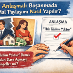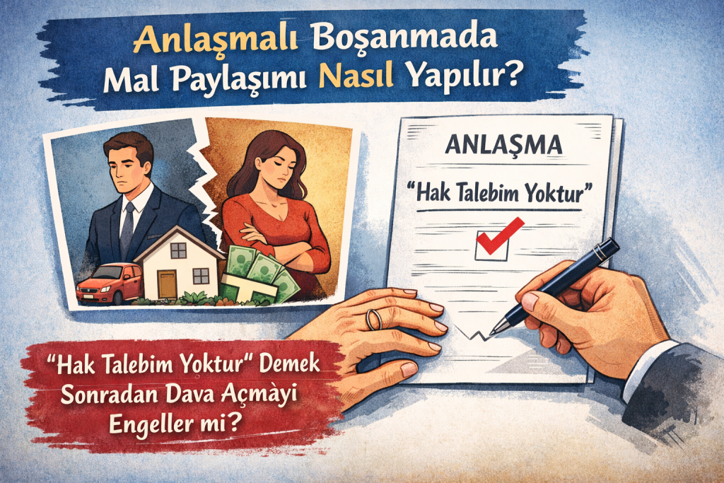 Anlaşmalı boşanmada “hak talebim yoktur” demek her zaman mal paylaşımından vazgeçildiği anlamına gelmez. Protokolde mal rejimi tasfiyesi açıkça düzenlenmemişse, eşler sonradan katılma alacağı veya katkı payı davası açabilir.