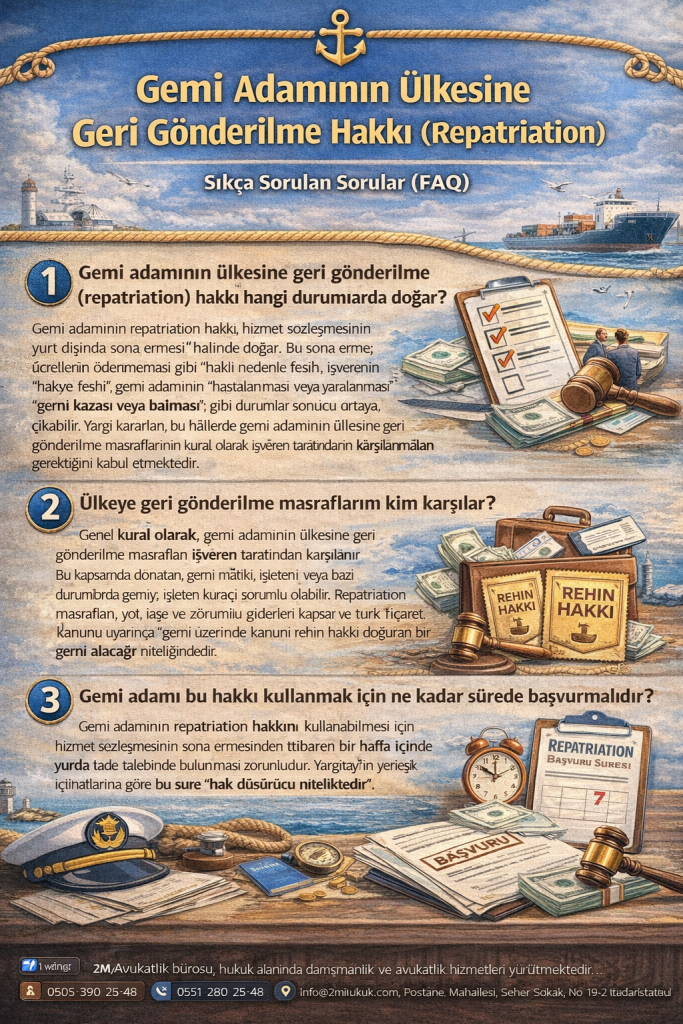 Gemi adamlarının ülkesine geri gönderilme (repatriation) hakkı, Türk Ticaret Kanunu ve Deniz İş Kanunu ile güvence altına alınmıştır. Ancak bu süreç, özellikle İstanbul limanları ve Tuzla bölgesinde yaşanan uyuşmazlıklarda, karmaşık yargı kararları ve sıkı süre şartları nedeniyle profesyonel destek gerektirir.