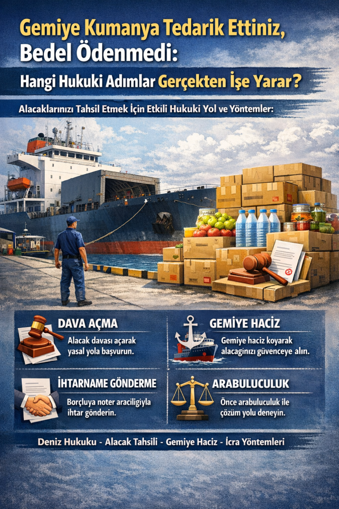 Sonuç: Gemiye kumanya sağlayan kişi; öncelikle ihtiyati haciz yoluyla gemiyi seferden men ederek alacağını güvenceye alabilir, ardından Denizcilik İhtisas Mahkemesi’nde icra takibi veya itirazın iptali davası açarak alacağını faizi ve icra inkar tazminatı ile birlikte tahsil edebilir.