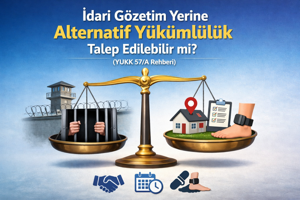 6458 sayılı Yabancılar ve Uluslararası Koruma Kanunu’nun 57/A maddesi, idari gözetim yerine uygulanabilecek alternatif yükümlülükleri tahdidi olarak düzenlemiştir. Bu yükümlülükler; belirli adreste ikamet etme, bildirimde bulunma (imza/parmak izi), aile temelli geri dönüş, geri dönüş danışmanlığı, kamu yararına gönüllü hizmet, teminat ve elektronik izleme tedbirlerinden oluşmaktadır. YUKK m.57/4 uyarınca idari gözetimin devamında zaruret bulunmadığı durumlarda gözetim kaldırılarak bu alternatif yükümlülüklerden bir veya birkaçı uygulanabilir.