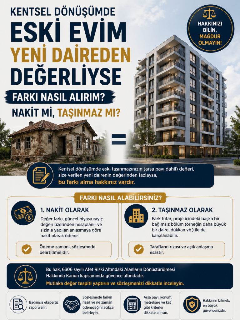 6306 Sayılı Kanun’un 6/3. maddesi ve Uygulama Yönetmeliği’nin 13/2a. maddesi, eski taşınmazın değerinin yeni konutun değerini aşması halinde ortaya çıkan fark alacağının üç yoldan biriyle —nakit, ilgili kurumun taşınmazı veya imar hakkı aktarımı— ödeneceğini açıkça düzenlemiştir. Bu hakkın etkin biçimde kullanılabilmesi, değerleme aşamasının bağımsız ve doğru yürütülmesine, sözleşmenin titizlikle müzakere edilmesine ve ödeme takviminin güvence altına alınmasına bağlıdır. Değerleme komisyonunun tespit ettiği bedele itiraz hakkı her zaman açıktır; bağımsız SPK lisanslı değerleme raporu bu itirazın hem idari hem yargısal boyutunda temel delil işlevi görür. (K. Md. 6/3 — Y. Md. 13/2a — Y. Md. 12)