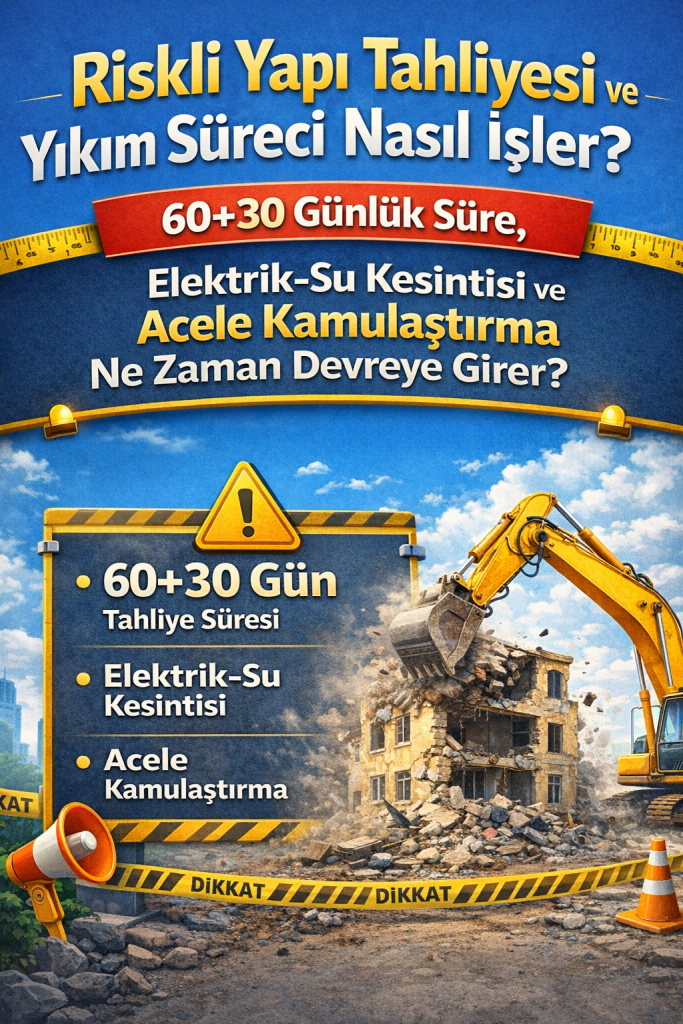 Riskli yapı tespiti kesinleştikten sonra tahliye ve yıkım süreci belirli aşamalara bağlıdır. 6306 sayılı Afet Riski Altındaki Alanların Dönüştürülmesi Hakkında Kanun m.5 ve Uygulama Yönetmeliği m.8 uyarınca temel ilke maliklerle anlaşma önceliğidir. Uzlaşma sağlanırsa geçici konut/işyeri veya kira yardımı gündeme gelir.