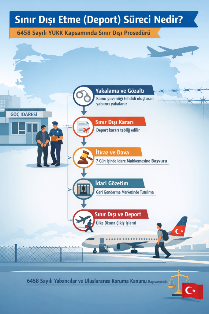 Türkiye’de sınır dışı etme süreci, 6458 sayılı Yabancılar ve Uluslararası Koruma Kanunu’nun (YUKK) yabancılar başlıklı ikinci kısmının sınır dışı etme başlıklı dördüncü bölümünde, 52 ila 60. maddeler arasında düzenlenmiştir. Bu düzenlemeler sınır dışı kararının alınması, uygulanması, itiraz yolları, idari gözetim, gönüllü geri dönüş ve masrafların tahsili gibi sürecin tüm aşamalarını kapsamaktadır.
