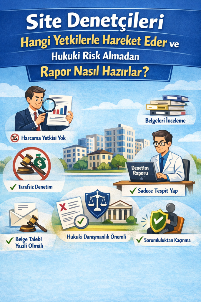 Ancak burada kritik ayrım şudur: denetçi bir “icra organı” değil, “gözetim organıdır”. Yargıtay içtihatlarına göre denetçilerin harcama yapma, sözleşme imzalama veya site adına işlem tesis etme yetkisi bulunmamaktadır. Bu nedenle denetçiler, yönetimin yerine geçerek karar alamaz; yalnızca yapılan işlemleri inceleyip raporlayabilir. Bu sınırın aşılması, denetçiyi doğrudan şahsi sorumluluk altına sokar.