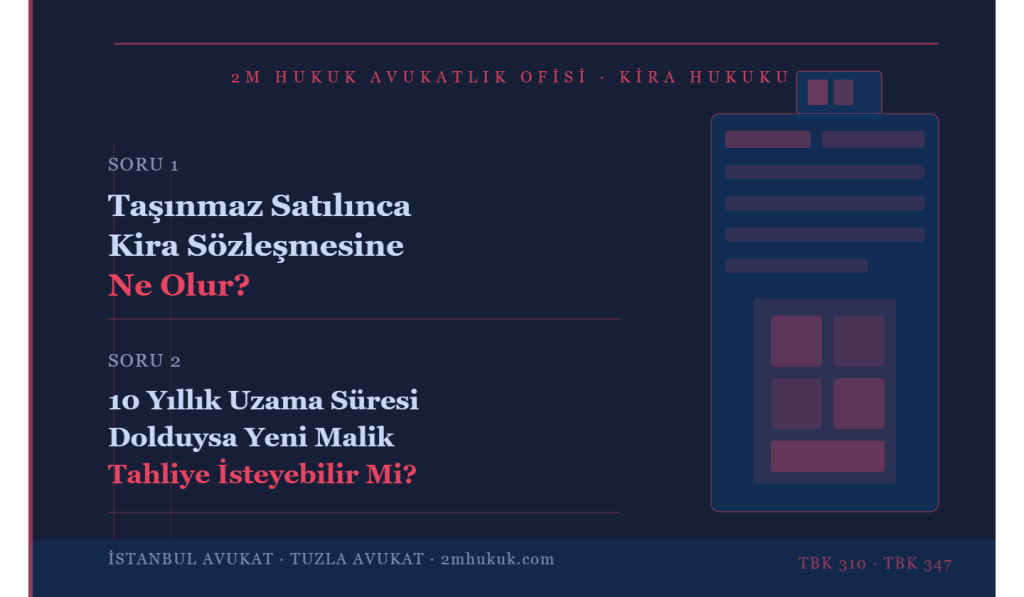 2M Hukuk Avukatlık Ofisi olarak İstanbul ve Tuzla’da kira hukuku, tahliye davaları, kira tespit ve uyarlama davaları ile taşınmaz hukuku alanlarında kapsamlı hizmet sunmaktayız. İstanbul kira avukatı veya Tuzla kira avukatı arıyorsanız, haklarınızı eksiksiz korumak için uzman kadromuzla iletişime geçebilirsiniz.